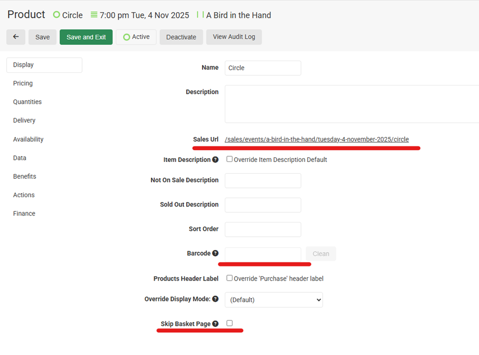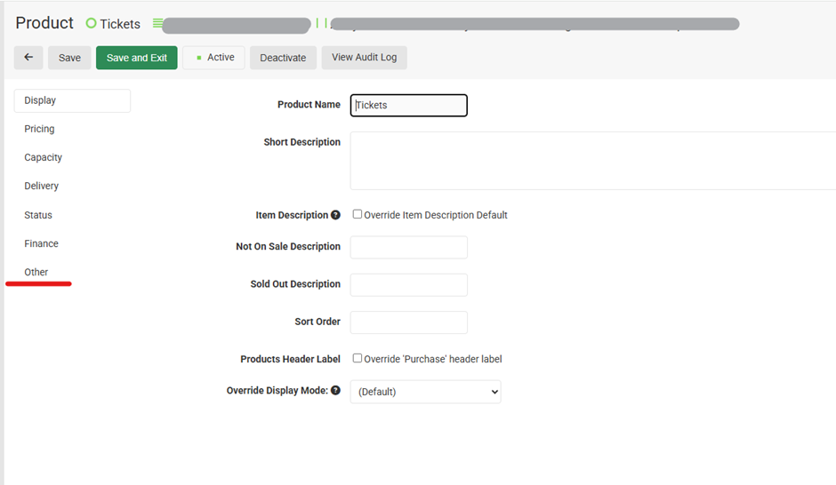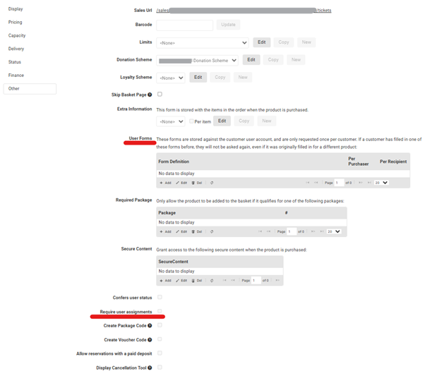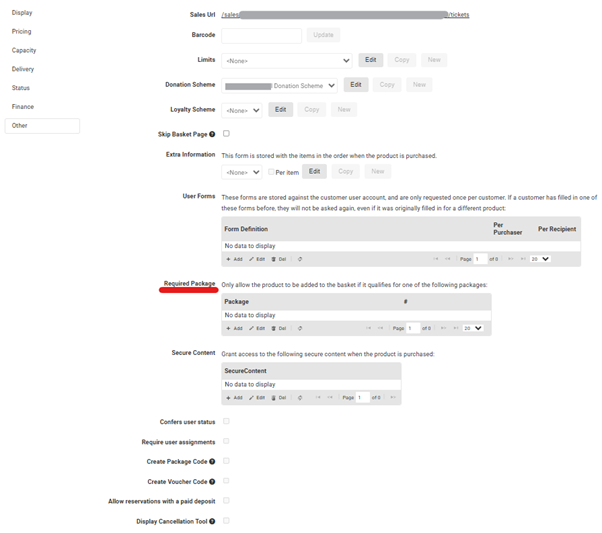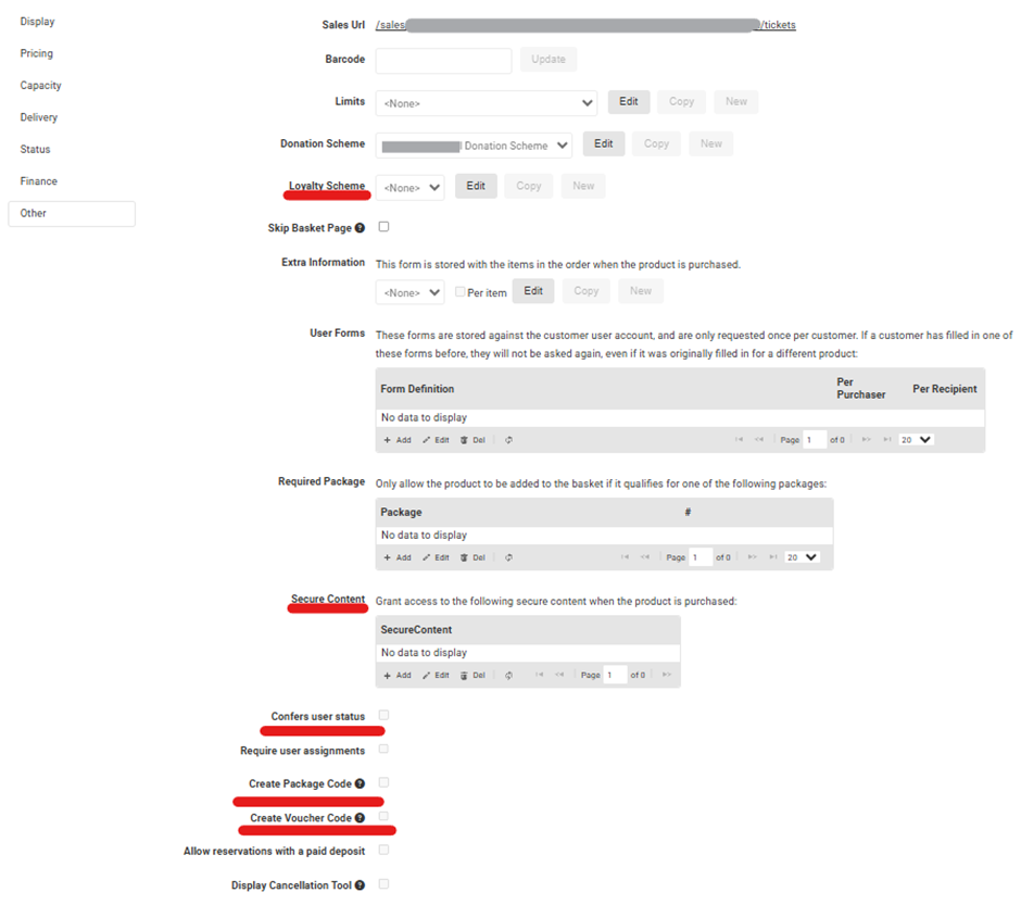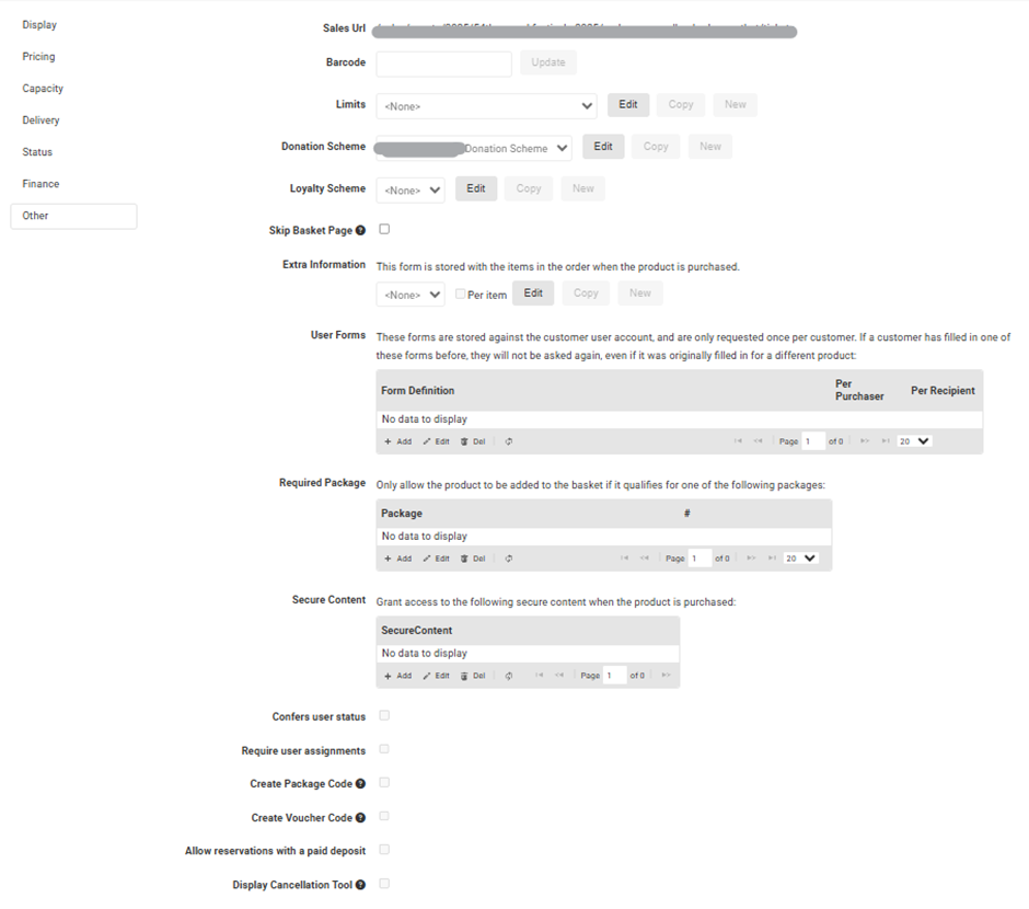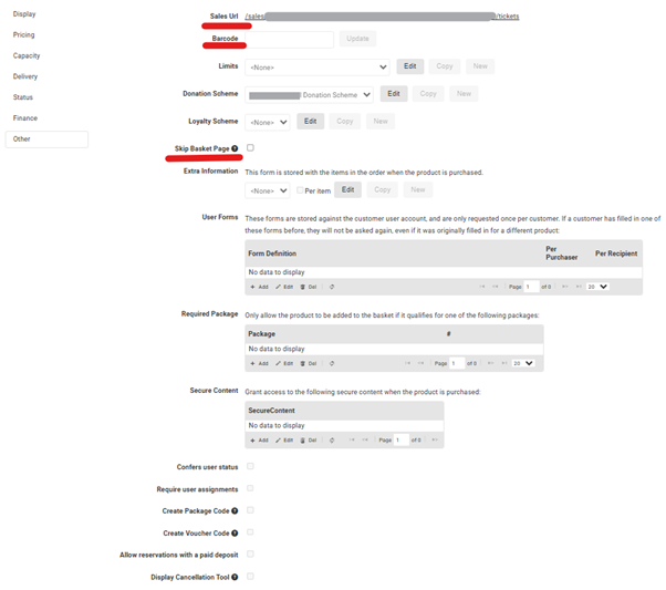 The Sales URL, Barcode, and Skip Basket Page option were originally found on the Other page, as seen here: