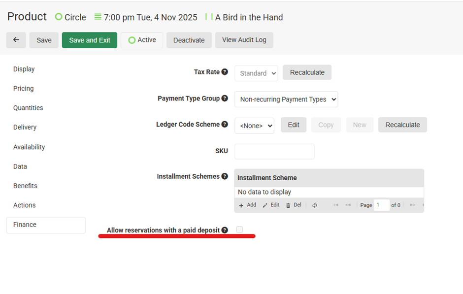 The final tab, Finance now includes the option to allow reservations with a deposit, which was originally found here on the Other tab: