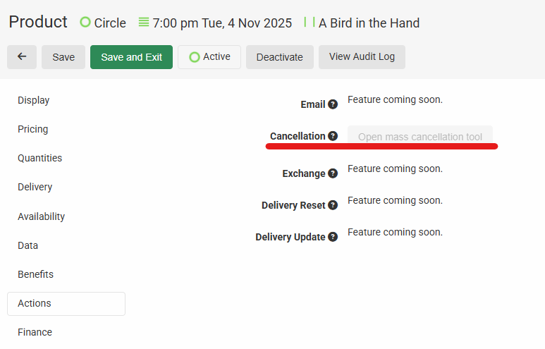 The mass cancellation tool has been renamed to ‘Cancellation’ and can now be found under the Actions tab.